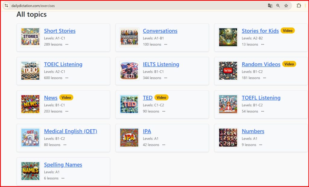 Không chỉ là hội thoại thông thường, mà còn có IELTS, TOEIC, TED, News…