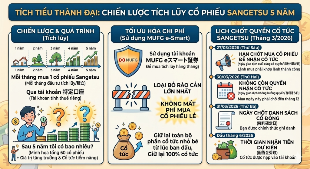 Tối ưu hóa chi phí: Nhờ sử dụng tài khoản MUFG eスマート証券 để mua tích lũy hàng tháng mà không mất phí, bạn đã loại bỏ được rào cản lớn nhất khi đầu tư cổ phiếu lẻ, giúp “giữ lại” toàn bộ phần cổ tức nhỏ bé lúc ban đầu.